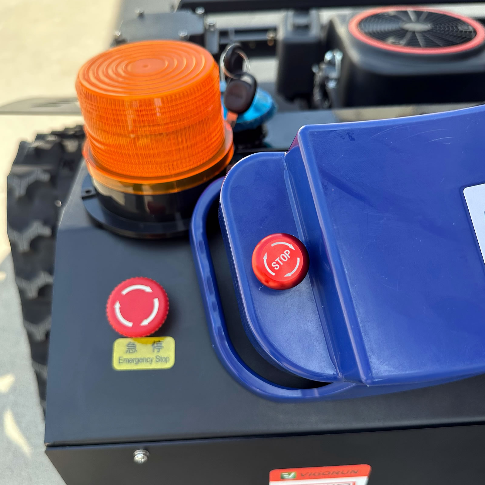 To ensure maximum safety, the VTLM800 is equipped with CE-certified warning lights and emergency stop buttons. The remote controller also features an emergency stop function, allowing operators to immediately shut down the machine if necessary. These redundant safety measures provide full protection during slope operations.