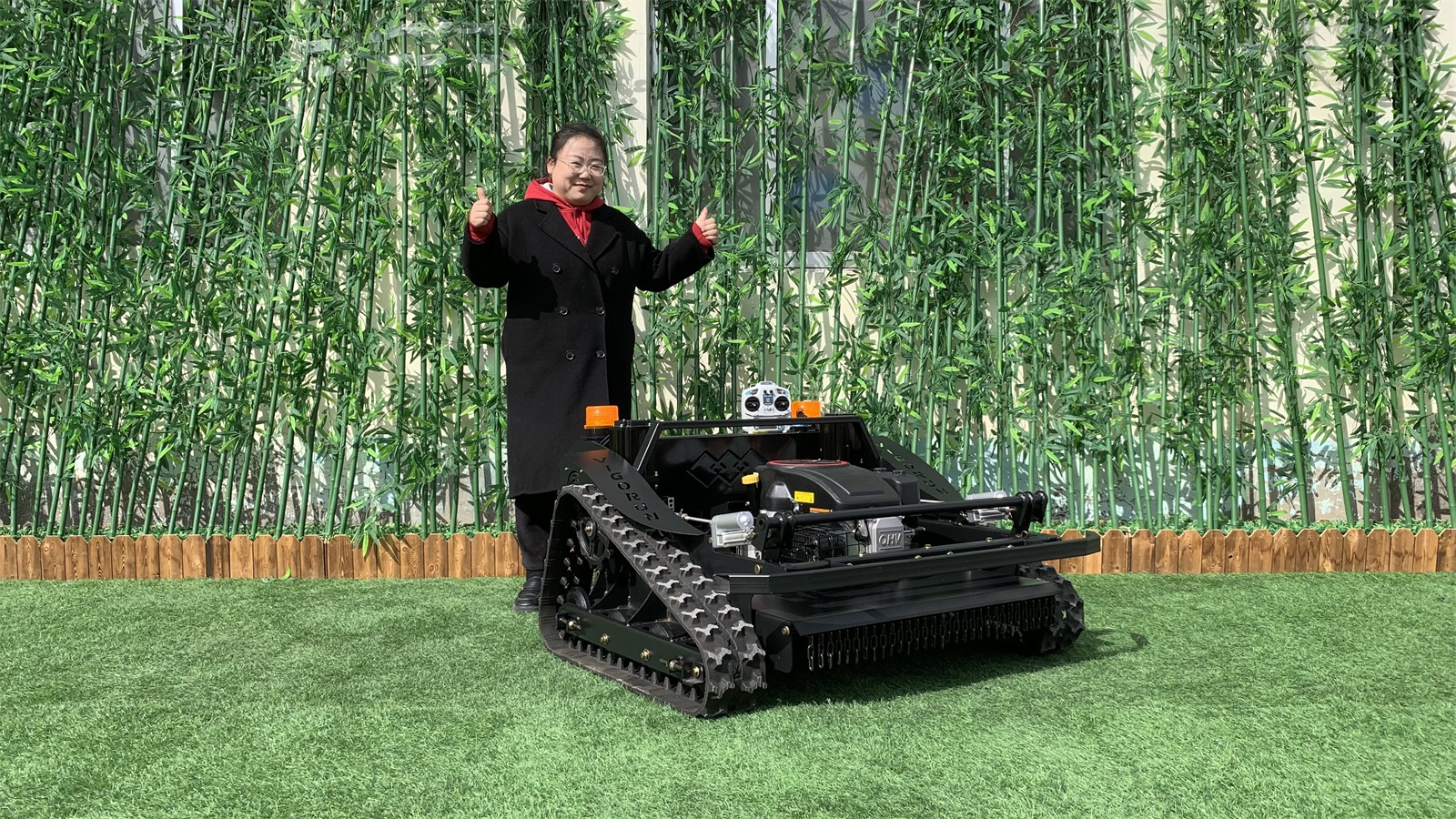 A high-quality remote control lawn mower is inseparable from high-quality accessories. From the engine brand, worm gear reducer, servo travel motor, strong and wide crawler, the overall high-thickness steel body, convenient and simple remote control operation, etc., every detail constitutes our current perfect equipment.